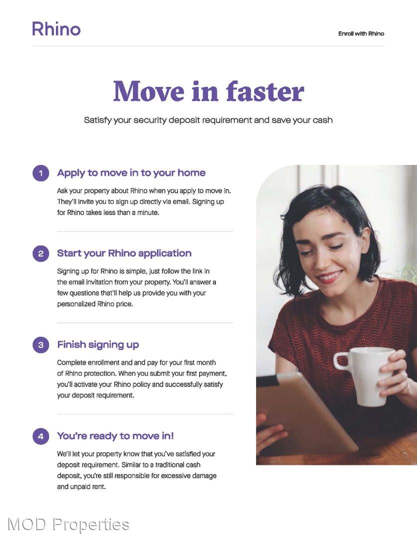 This unit offers reduced upfront costs with Rhino. Ask us how you can save cash on the deposit requirements when you move in. If you opt out of this program our standard deposit is equivalent to one full month of rent.